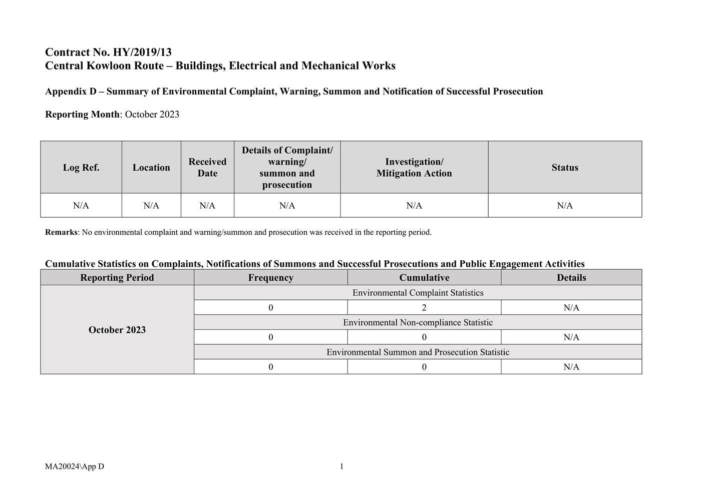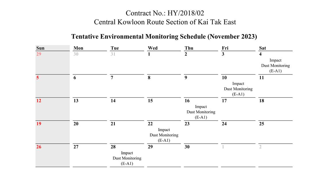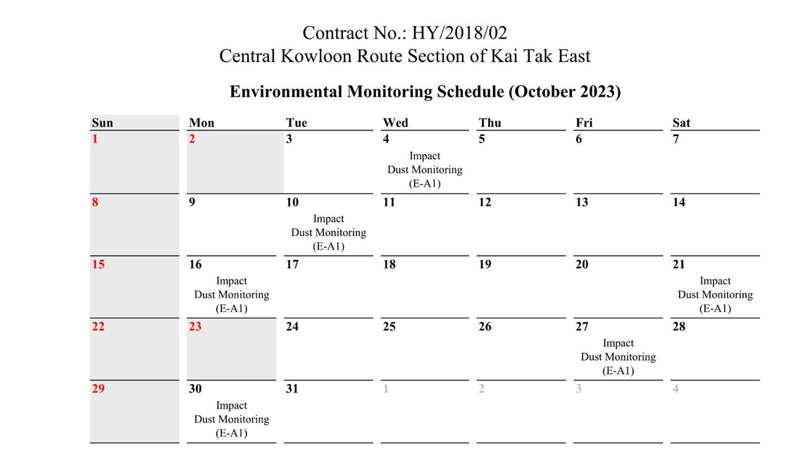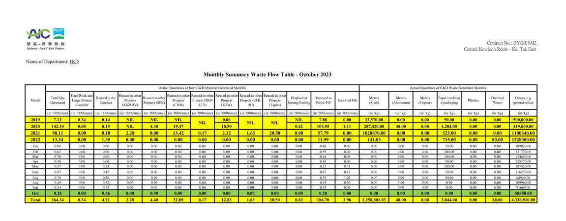 A.1 Alchmex – Paul Y Joint Venture (“Contractor”) commenced the construction works of Highway Department (HyD) Central Kowloon Route Contract No. HY/2018/02 – Section of Kai Tak East (“The Project”) on 9 September 2019. This report is the 50th monthly Environmental Monitoring and Audit (EM&A) report presenting the EM&A works carried out during the period from 1 October 2023 to 31 October 2023.