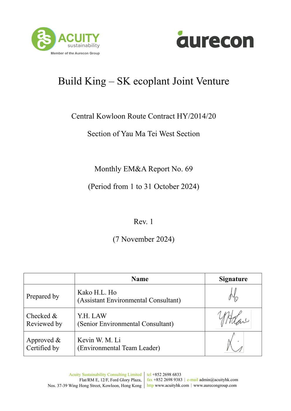 A.1          Build King – SK ecoplant Joint Venture (“Contractor”) commenced the construction works of Highway Department (HyD) Central Kowloon Route Contract No. HY/2014/20 – Section of Yau Ma Tei West (“The Project”) on 12 February 2019. This is the 69th monthly Environmental Monitoring and Audit (EM&A) report presenting the EM&A works carried out during the period from 1 October 2024 to 31 October 2024.