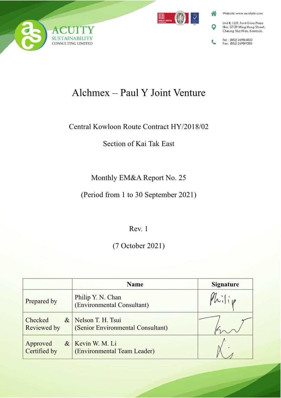 A.1 Alchmex – Paul Y Joint Venture (“Contractor”) commenced the construction works of Highway Department (HyD) Central Kowloon Route Contract No. HY/2018/02 – Section of Kai Tak East (“The Project”) on 9 September 2019. This is the 25th monthly Environmental Monitoring and Audit (EM&A) report presenting the EM&A works carried out during the period from 1 September 2021 to 30 September 2021.