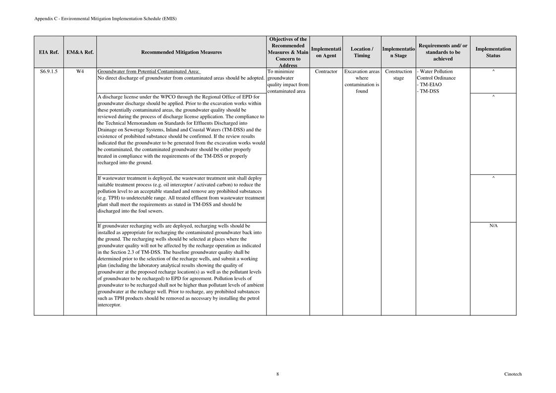 6.3 According to Environmental Permit, the approved EIA Report (Register No.: AEIAR-171/2013), and the EM&A Manual of the Project, the mitigation measures detailed in the documents are recommended to be implemented during the construction phase. An Environmental Mitigation Implementation Schedule (EMIS) is provided in Appendix C.