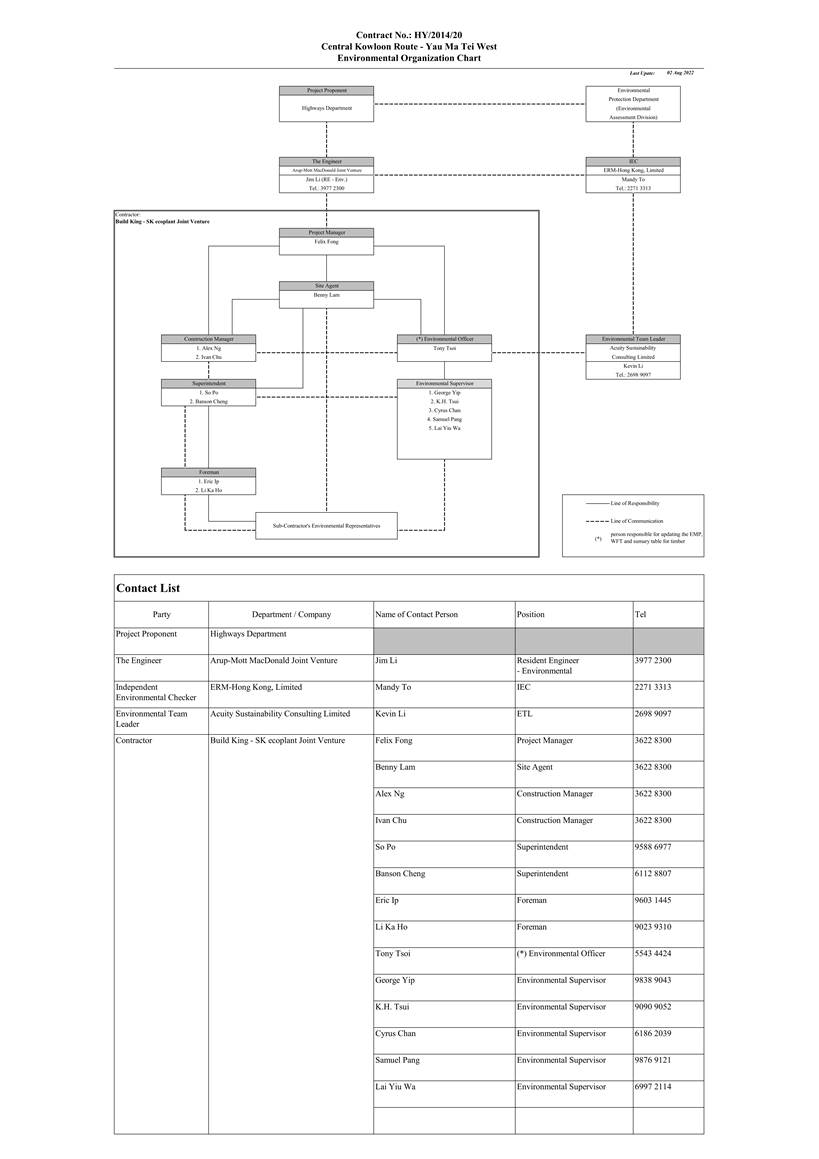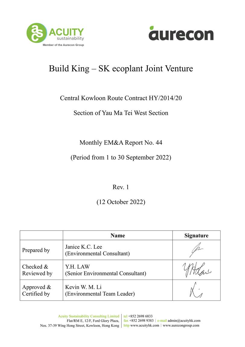A.1 Build King – SK ecoplant Joint Venture (“Contractor”) commenced the construction works of Highway Department (HyD) Central Kowloon Route Contract No. HY/2014/20 – Section of Yau Ma Tei West (“The Project”) on 12 February 2019. This is the 44th monthly Environmental Monitoring and Audit (EM&A) report presenting the EM&A works carried out during the period from 1 September 2022 to 30 September 2022.