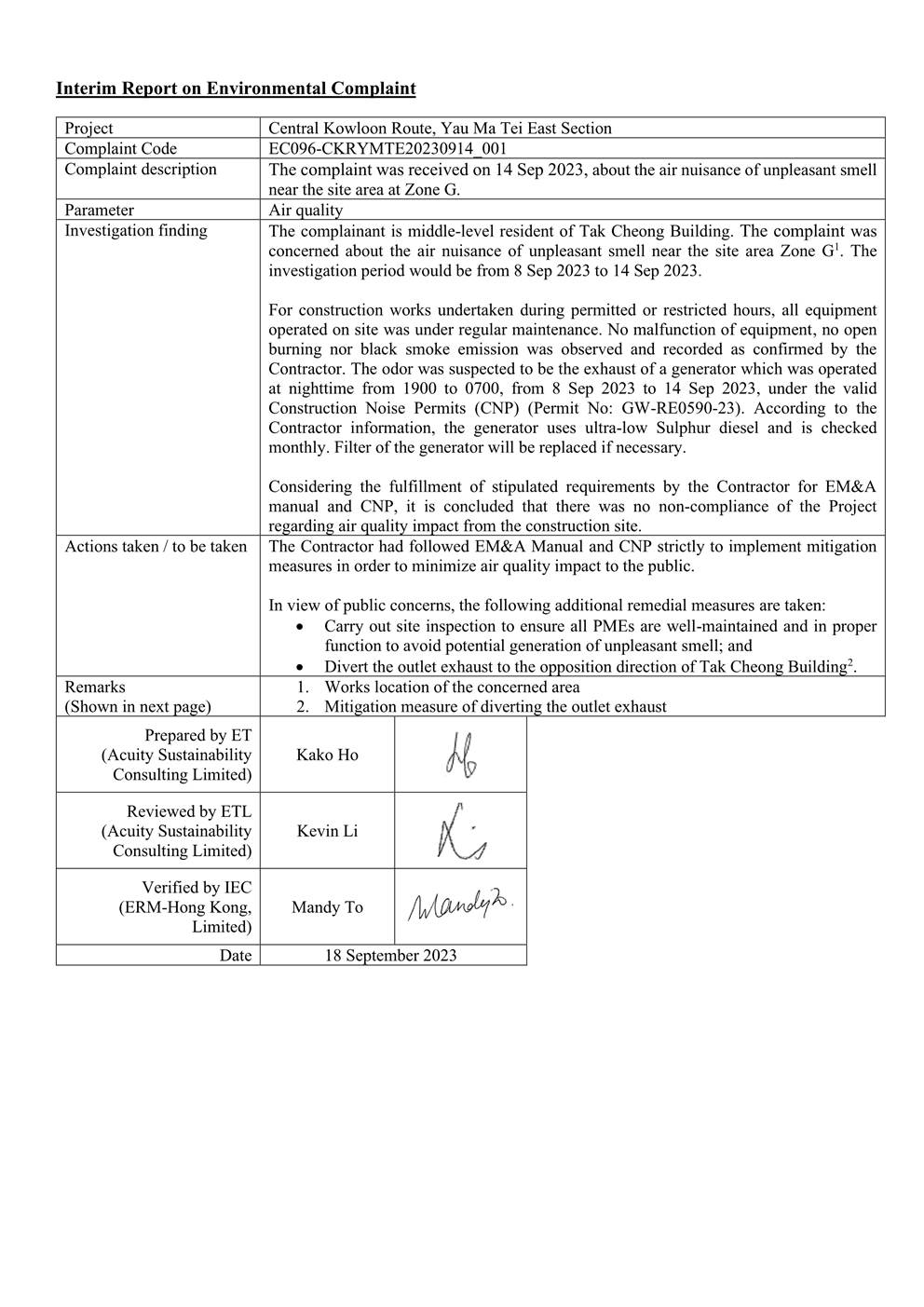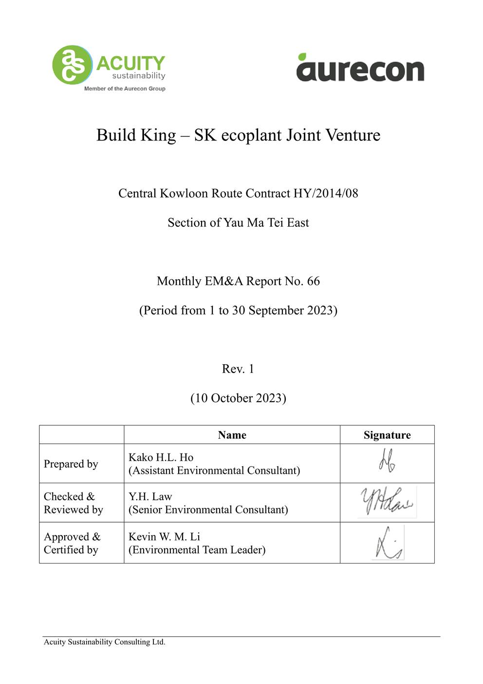 A.1 Build King – SK ecoplant Joint Venture (“Contractor”) commenced the construction works of Highway Department (HyD) Central Kowloon Route Contract No. HY/2014/08 – Section of Yau Ma Tei East (“The Project”) on 20 April 2018. This is the 66th monthly Environmental Monitoring and Audit (EM&A) report presenting the EM&A works carried out during the period from 1 September 2023 to 30 September 2023.