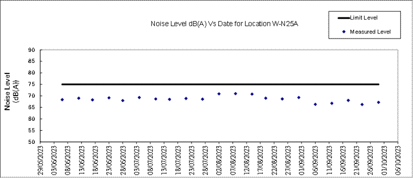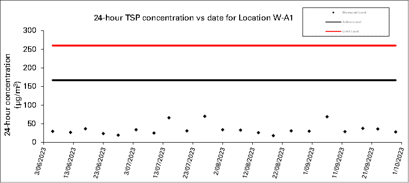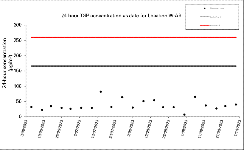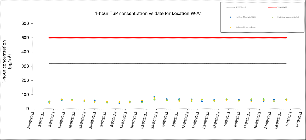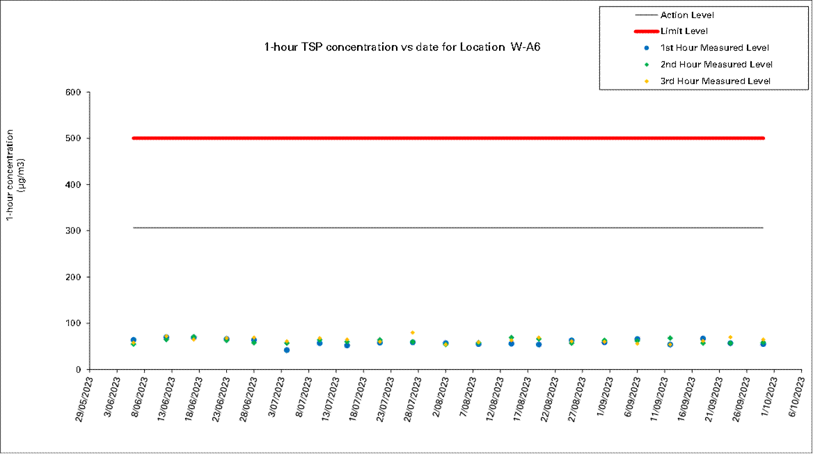 A.7 Two Action Level of construction noise was triggered during the reporting month as documented complaints were received. No exceedance of Limit Level of construction noise was recorded in the reporting month. No exceedance of the Action and Limit Level of 24-hour TSP and 1-hour TSP was recorded in the reporting month.