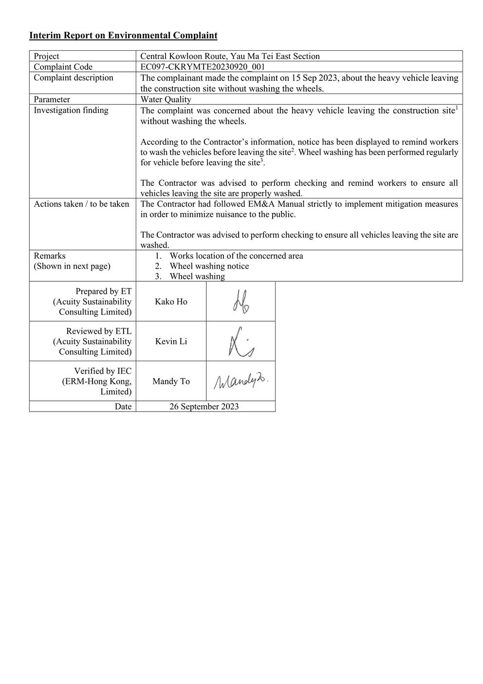 A.5 Joint weekly site inspections were conducted by representatives of the Environmental Team (ET), Contractor and Engineer on 7, 15, 21 and 28 September 2023. One joint site inspection with IEC was also undertaken on 15 September 2023. Details of the audit findings and implementation status are presented in Section 5.