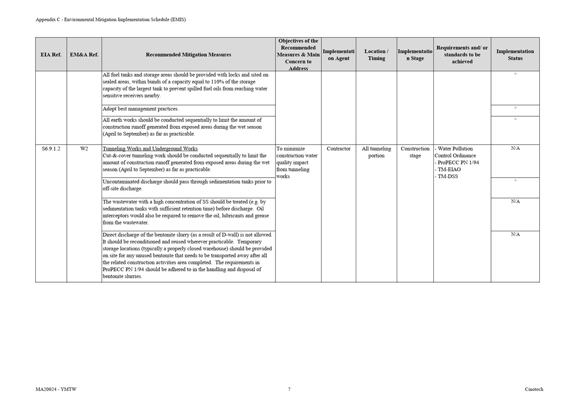 · Cut-&-cover tunnelling work should be conducted sequentially to limit the amount of construction runoff generated from exposed areas during the wet season (April to September) as far as practicable. · Uncontaminated discharge should pass through sedimentation tanks prior to off-site discharge; · The wastewater with a high concentration of SS should be treated (e.g. by sedimentation tanks with sufficient retention time) before discharge. Oil interceptors would also be required to remove oil, lubricants and grease from the wastewater; · Direct discharge of the bentonite slurry (as a result of D-wall) is not allowed. It should be reconditioned and reused wherever practicable. Temporary storage locations (typically a properly closed warehouse) should be provided on site for any unused bentonite that needs to be transported away after all the related construction activities area completed. The requirements in ProPECC PN 2/23 should be adhered to in the handling and disposal of bentonite slurries. |