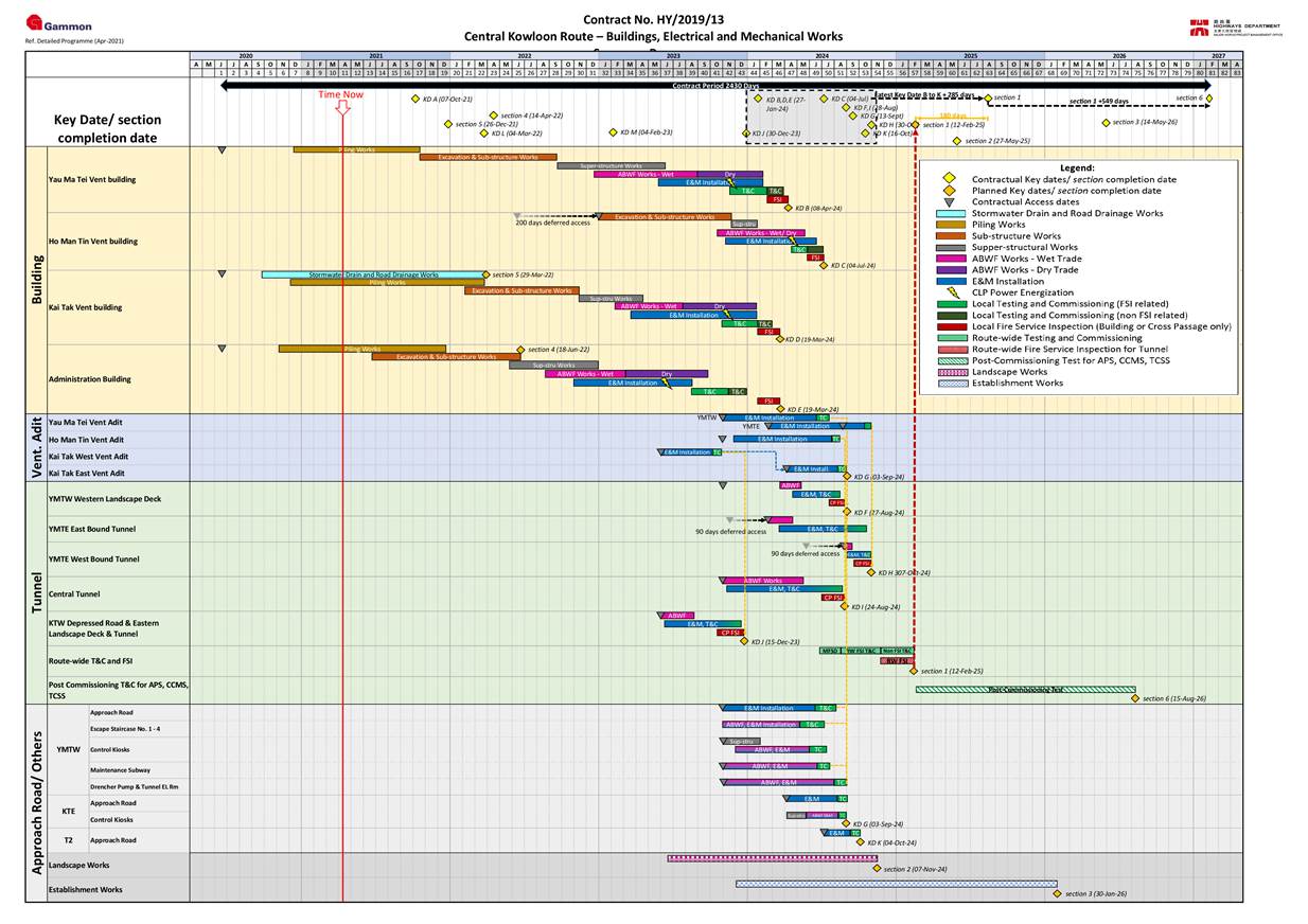 · Pre-drilling Works at Portion 1B, 1D, 1E and 1F · Socket H-pile at Portion 1B, 1D, 1E, 1F and 1G · Removal of existing Steel Bridge at Portion 1B, 1E and 1G · Reinforced Concrete(RC) works for Vent Adit at Ch 0-60 & Temporary Bulkhead Wall at Portion 9 · ELS and Excavation Works (Segment 4, 7, 10 to 12) for Vent Adit and Depressed Road Construction at Portion 1F and 10 · Guide Wall and D-Wall breaking works and Capping Beam Construction at Portion 1F · Jacking Pit/ Receiving Pit Construction of Sewerage System at Portion 1B · Pipe Jacking for DN 1650 sewer at Portion 1B and 17 · GRP Pipe Installation for New Sewerage at Portion 17, 1B and 1G · Vent Adit Ch 130~175 at Portion 1B · Bridge Deck Construction at Bridge B2/C2 (C2P1, C2P2 and B2P1) at Portion 1E · Pile Cap for B2P3 (Bridge B2) at Portion 1G · Pile Cap and Pier for CP1 (Bridge C) at Portion 1E · Temporary Lin Cheung Road (2nd Diversion) at Portion 1E · ELS and Excavation prior to Box Culvert B Construction and Vent Adit Ch250-280 at Portion 1D · Construction of Box Culvert B (Zone 4A) at Portion 1D · Bridge Deck Construction at Bridge G at Portion 1B |