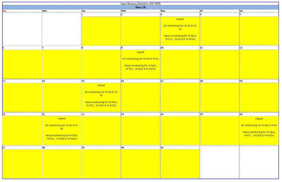 A.7 Joint weekly site inspections were conducted by representatives of the Contractor, Engineer and Contractor’s ET on 12 and 26 April 2018. The representative of IEC joined the site inspection on 12 April 2018 to review the site preparation works before the construction commencement day. Details of the audit findings and implementation status are presented in Section 6.