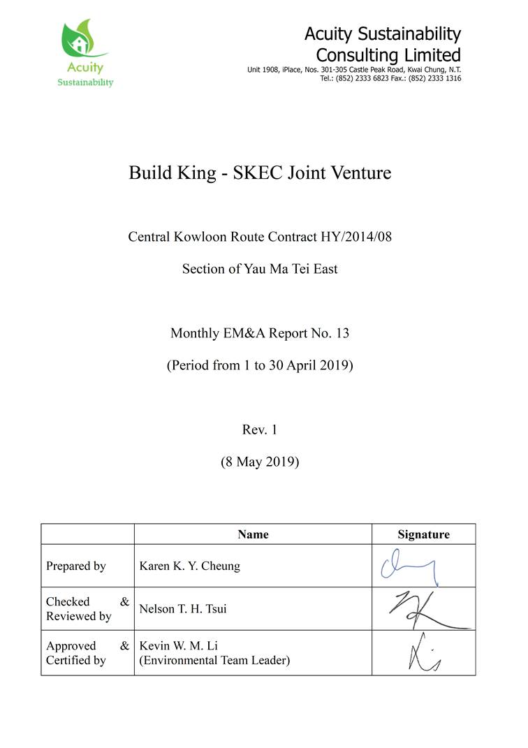 A.1 Build King – SKEC Joint Venture (“Contractor”) commenced the construction works of Highway Department (HyD) Central Kowloon Route Contract No. HY/2014/08 – Section of Yau Ma Tei East (“The Project”) on 20 April 2018. This is the 13th monthly Environmental Monitoring and Audit (EM&A) report presenting the EM&A works carried out during the period from 1 April 2019 to 30 April 2019.