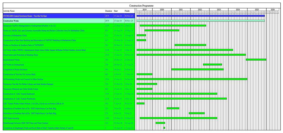 · Architectural Builders Works and Finishes (ABWF) and Electrical and Mechanical (E&M) works after power changeover of LV switch box and Generators of New West Building of Methadone Clinic (MC) · Sheet Piling and Curtain Grouting at Zone E Yau Ma Tei Access Shaft (YMTAS) · Excavation down to -0.5mPd at Zone E Yau Ma Tei Access Shaft (YMTAS) · Construction of Ground Beam and Slab at Zone E Yau Ma Tei Access Shaft (YMTAS) · Construction of super structure, Architectural Builders Works and Finishes (ABWF) and Electrical and Mechanical (E&M) works at Temporary Maternal and child health Centre (TMCHC). · Diaphragm wall construction at Zone A · Interface Coring and Toe Grouting Works at Zone A · King Post Construction at Zone A · Drilling Pump Well at Zone A · Jet Grouting Works at C · Utilities and Drainage Diversion at Zone C · Grouting Works at YMTPS · Socket H-pile Construction at YMTPS · Socket H-pile and ELS work at TPLCJHB · Modification of Yau Cheung Road · Installation of instrumentation for all areas |