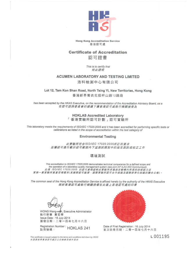 J. The Certification of Laboratory with HOKLAS Accredited Analytical Tests