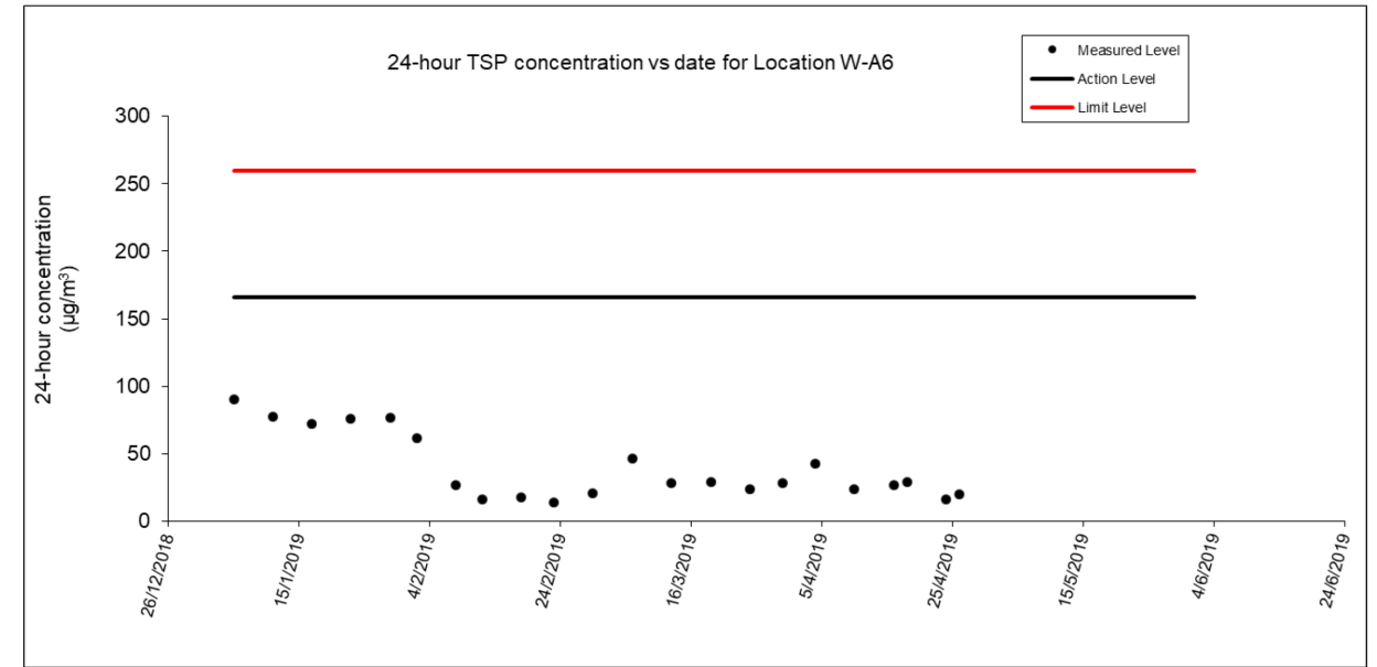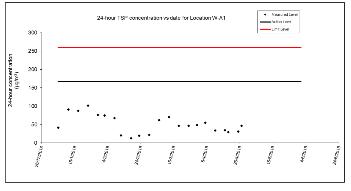 A.10 No exceedance of the Action and Limit Levels of 24-hour TSP and 1-hour TSP monitoring were recorded during the reporting period.