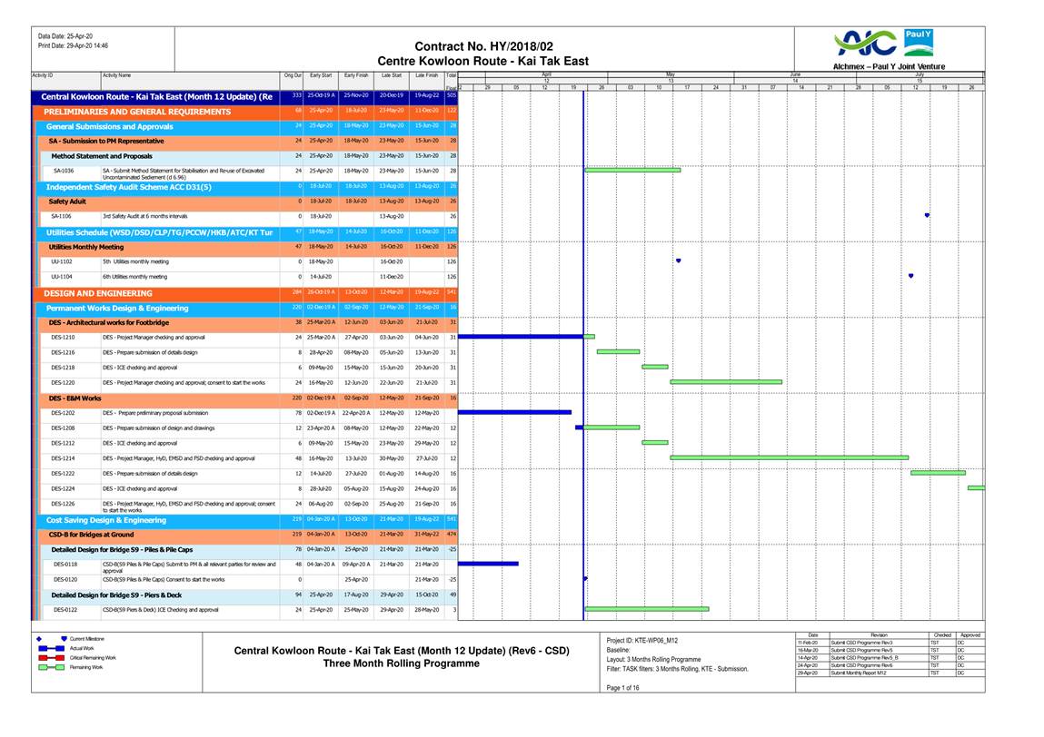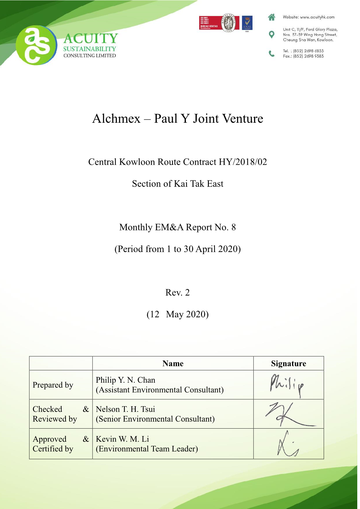 A.1 Alchmex – Paul Y Joint Venture (“Contractor”) commenced the construction works of Highway Department (HyD) Central Kowloon Route Contract No. HY/2018/02 – Section of Kai Tak East (“The Project”) on 9 September 2019. This is the 8th monthly Environmental Monitoring and Audit (EM&A) report presenting the EM&A works carried out during the period from 1 April 2020 to 30 April 2020.
