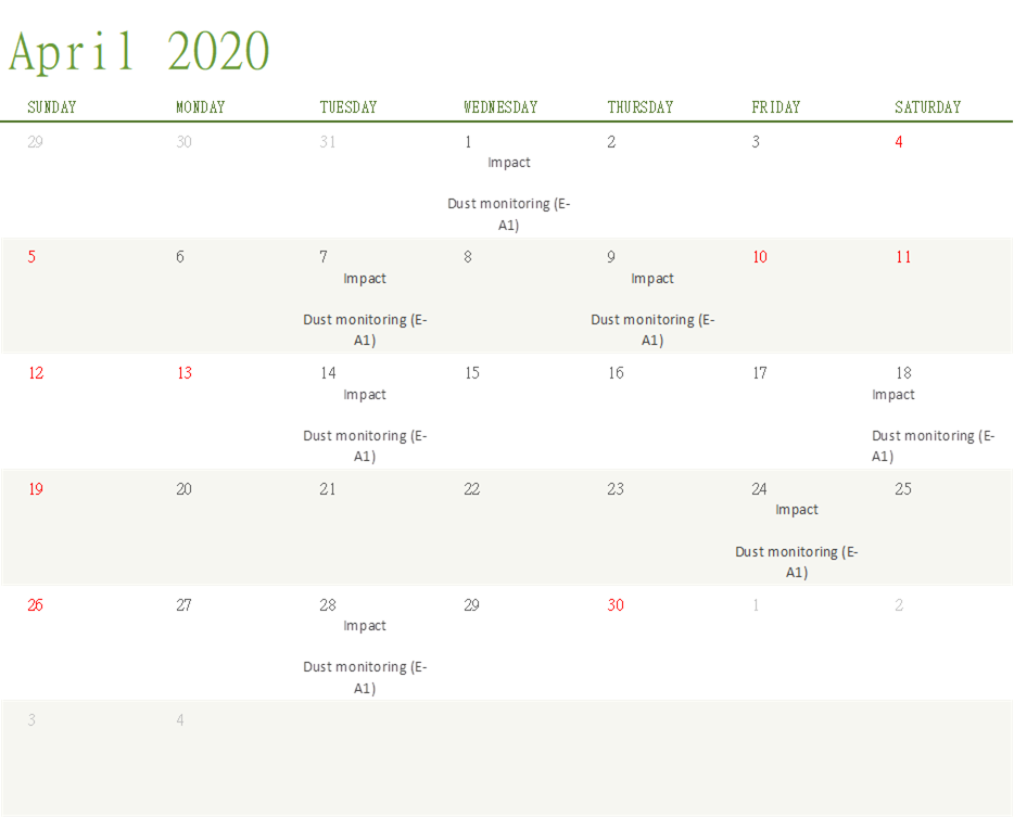 A.5 Bi-weekly inspection of the implementation of landscape and visual mitigation measures by ET was conducted on 1, 15 and 29 April 2020. Details of the audit findings and implementation status are presented in Section 5.