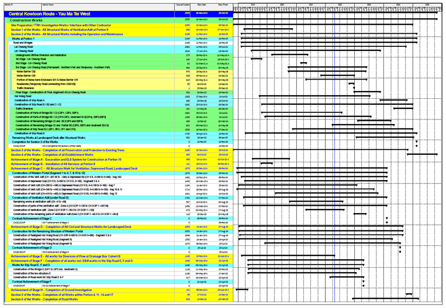 · Pre-drilling Works at Portion 1B, 1D, 1E and 1F · Socket H-pile at Portion 1B, 1D, 1E, 1F and 1G · Construction of Vent. Adit Ch 90~130 (Zone 3) · Construction of Noise Barrier C02, C03 & S01 (along Lin Cheung Road) at Portion 1E · Bridge Deck Construction at Bridge C2 (from C2P1 to C2P2) at Portion 1E · Pile Cap C2P3-CP3 at Portion 1E · Bridge Deck Construction at Bridge B2 (Existing Pier D3 to B2P1) at Portion 1E · Pier and Pile cap construction for Bridge B (BP1) and Bridge C (CP2) · Pile Cap DPC1 and Abutment B for Bridge D at Portion 1E · Parapet Wall Construction at Bridge G at Portion 1B · Abutment Wall Construction at Slip Road E at portion 1B · Re-construction of Box Culvert A (Zone A2) at Portion 1D · Excavation and Lateral Support Works (Segment 4, 7, 10 to 12) for Vent. Adit and Depressed Road Construction including Escape Route Staircase No.1 to 3 at Portion 1F and 10 · Vent Adit Ch 300~360 at Segement 4, 7 & 10 at Portion 1F · Vent Adit Ch 360~410 at Segement 11 at Portion 1F · Pile Cap and Column Construction along Hoi Wang Road (Segment 5, 6, 7, 8 and 9) at Portion 1D |
