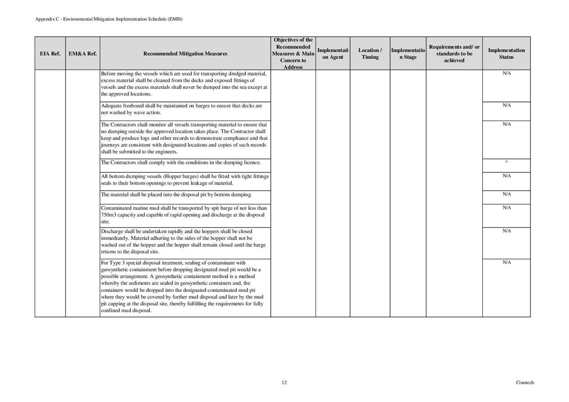 6.3 According to Environmental Permit, the approved EIA Report (Register No.: AEIAR-171/2013), and the EM&A Manual of the Project, the mitigation measures detailed in the documents are recommended to be implemented during the construction phase. An Environmental Mitigation Implementation Schedule (EMIS) is provided in Appendix C.