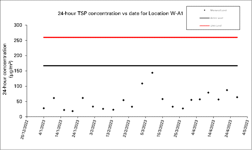 A.7 Three Action Levels of construction noise were triggered during the reporting month as documented complaints were received. No exceedance of Limit Level of construction noise was recorded in the reporting month. No exceedance of the Action and Limit Level of 24-hour TSP and 1-hour TSP was recorded in the reporting month.