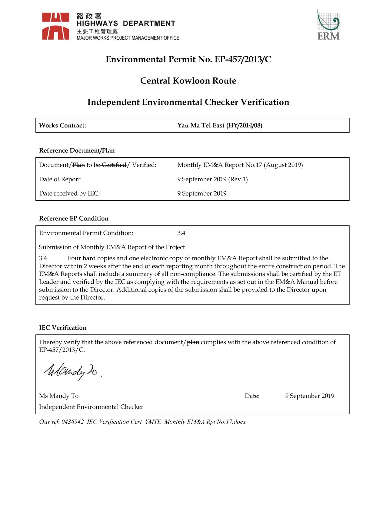1.2. The Central Kowloon Route – Design and Construction Environmental Impact Assessment Report (Register No.: AEIAR-171/2013) was approved with conditions by the Environmental Protection Department (EPD) on 11 July 2013. An Environmental Permit (EP 457/2013) was issued on 9 August 2013. Variations of EP (VEP) was subsequently applied for and the latest EP (EP-457/2013/C) was issued by EPD on 16 January 2017. A Further EP (FEP-02/457/2013/C) was issued by EPD on 5 March 2018.