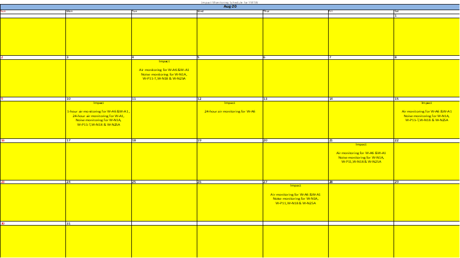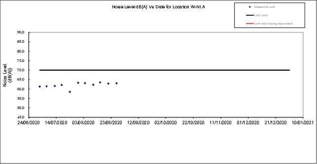 A.4 Noise monitoring station at the Coronation Tower 1 (W-P11) was temporarily suspended from 3 August 2020 to 16 August 2020due to a case of novel coronavirus infection at the Coronation Tower 6. Temporary alternative noise monitoring location, W-P11-T was used to conduct noise monitoring on 4, 10 and 15 August 2020. Details of temporary alternative monitoring location are presented in Temporary Alternative Proposal for Monitoring Station as proposed by ET and agreed by IEC dated 27 March 2020.
