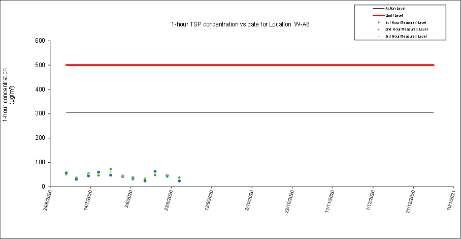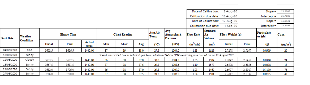 A.5 Due to the technical problem for HVS equipment on 10 August 2020 at Man Cheong Building (W-A6), 24-hour TSP dust monitoring was suspended. Equipment inspection was conducted and the problem was fixed on 12 August 2020. Supplementary 24-hour TSP dust monitoring was conducted on the same day.