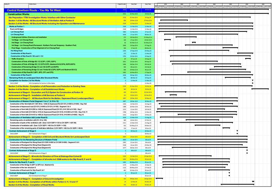 · Pre-drilling Works at Portion 1B and 1D · Socket H-Pile (Landscaped Deck and Bridges) at Portion 1B and 1D · Construction of Vent. Adit Ch 90~130 (Zone 3) at Portion 1E · Construction of Noise Barrier C02, C03 & S01 (along Lin Cheung Road) at Portion 1E · Bridge Deck Construction at Bridge C2 Deck 2 and Bridge B2 Deck 1 at Portion 1E · Bridge Deck Construction at Bridge C2 Deck 3 and Bridge B2 Deck 2 at Portion 1E · Pier Construction CP3, C2P3, B2P2 and BP2 at Portion 1E · Bridge Deck Construction at Bridge C Deck 2 and Bridge B Deck 1 at Portion 1E · Pile Cap DPC1 and Abutment A & B for Bridge D at Portion 1E · Vent. Adit Ch 175~240 at Zone 4B, 4C and A1 at Portion 1E · Parapet Wall Construction at Bridge G at Portion 1B · Abutment Wall Construction at Slip Road E at portion 1B · Excavation and Lateral Support Works (Segment 4, 7, 10 to 12) for Vent. Adit and Depressed Road Construction including Escape Route Staircase No. 1 to 3 at Portion 1F and 10 · Vent Adit Ch 280~290 at Segment 4 at Portion 1D · Vent Adit Ch 300~360 at Segments 7 & 10 including Road Slab at Portion 1F · Vent Adit Ch 360~410 at Segment 11 including Road Slab at Portion 1F · Elevated Hoi Wang Road at Portion 1D · Pile Cap and Column Construction along Hoi Wang Road (Segment 5, 6, 7, 8 and 9) at Portion 1D |