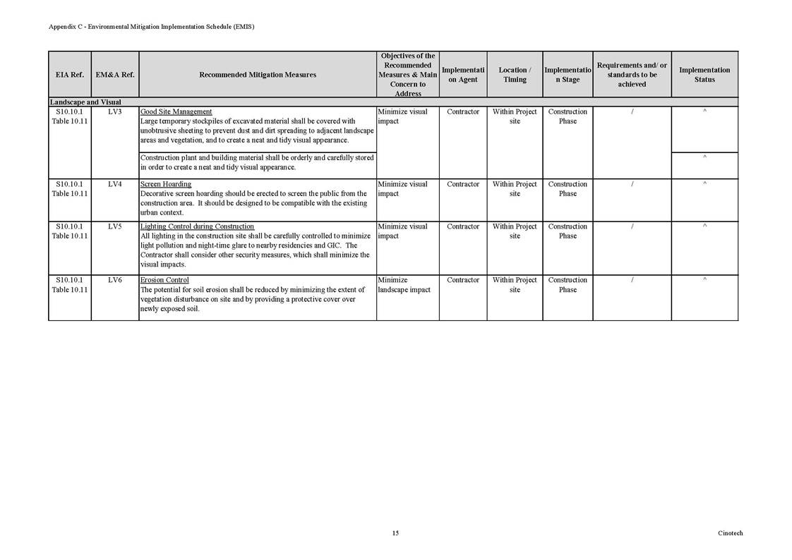 6.3 According to Environmental Permit, the approved EIA Report (Register No.: AEIAR-171/2013), and the EM&A Manual of the Project, the mitigation measures detailed in the documents are recommended to be implemented during the construction phase. An Environmental Mitigation Implementation Schedule (EMIS) is provided in Appendix C.