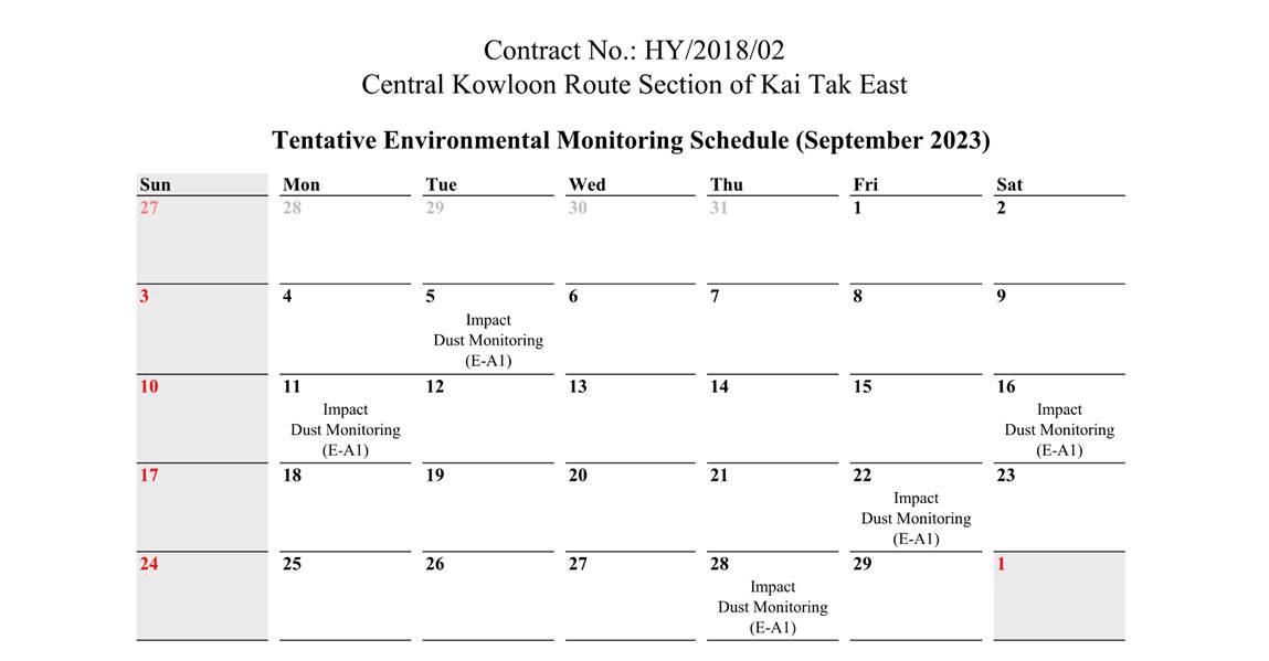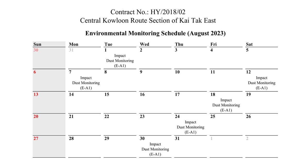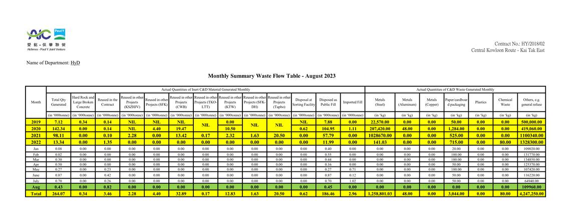A.1 Alchmex – Paul Y Joint Venture (“Contractor”) commenced the construction works of Highway Department (HyD) Central Kowloon Route Contract No. HY/2018/02 – Section of Kai Tak East (“The Project”) on 9 September 2019. This report is the 48th monthly Environmental Monitoring and Audit (EM&A) report presenting the EM&A works carried out during the period from 1 August 2023 to 31 August 2023.
