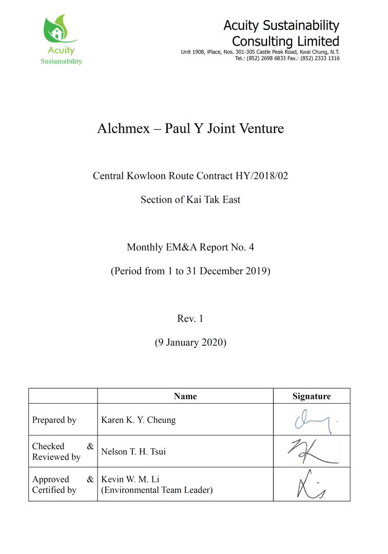 A.1 Alchmex – Paul Y Joint Venture (“Contractor”) commenced the construction works of Highway Department (HyD) Central Kowloon Route Contract No. HY/2018/02 – Section of Kai Tak East (“The Project”) on 9 September 2019. This is the 4th monthly Environmental Monitoring and Audit (EM&A) report presenting the EM&A works carried out during the period from 1 December 2019 to 31 December 2019.