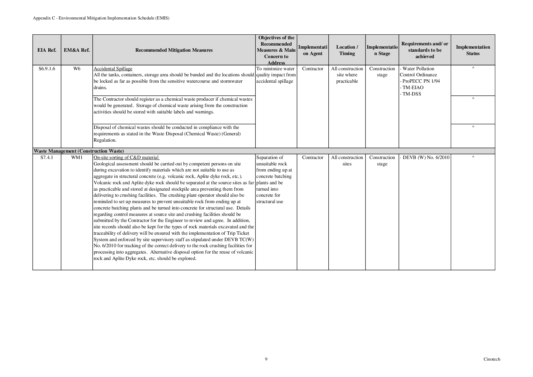 6.3 According to Environmental Permit, the approved EIA Report (Register No.: AEIAR-171/2013), and the EM&A Manual of the Project, the mitigation measures detailed in the documents are recommended to be implemented during the construction phase. An Environmental Mitigation Implementation Schedule (EMIS) is provided in Appendix C.