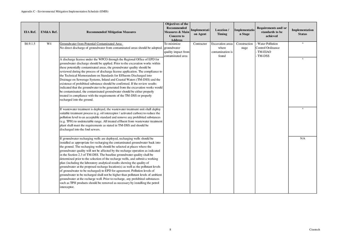 6.3 According to Environmental Permit, the approved EIA Report (Register No.: AEIAR-171/2013), and the EM&A Manual of the Project, the mitigation measures detailed in the documents are recommended to be implemented during the construction phase. An Environmental Mitigation Implementation Schedule (EMIS) is provided in Appendix C.