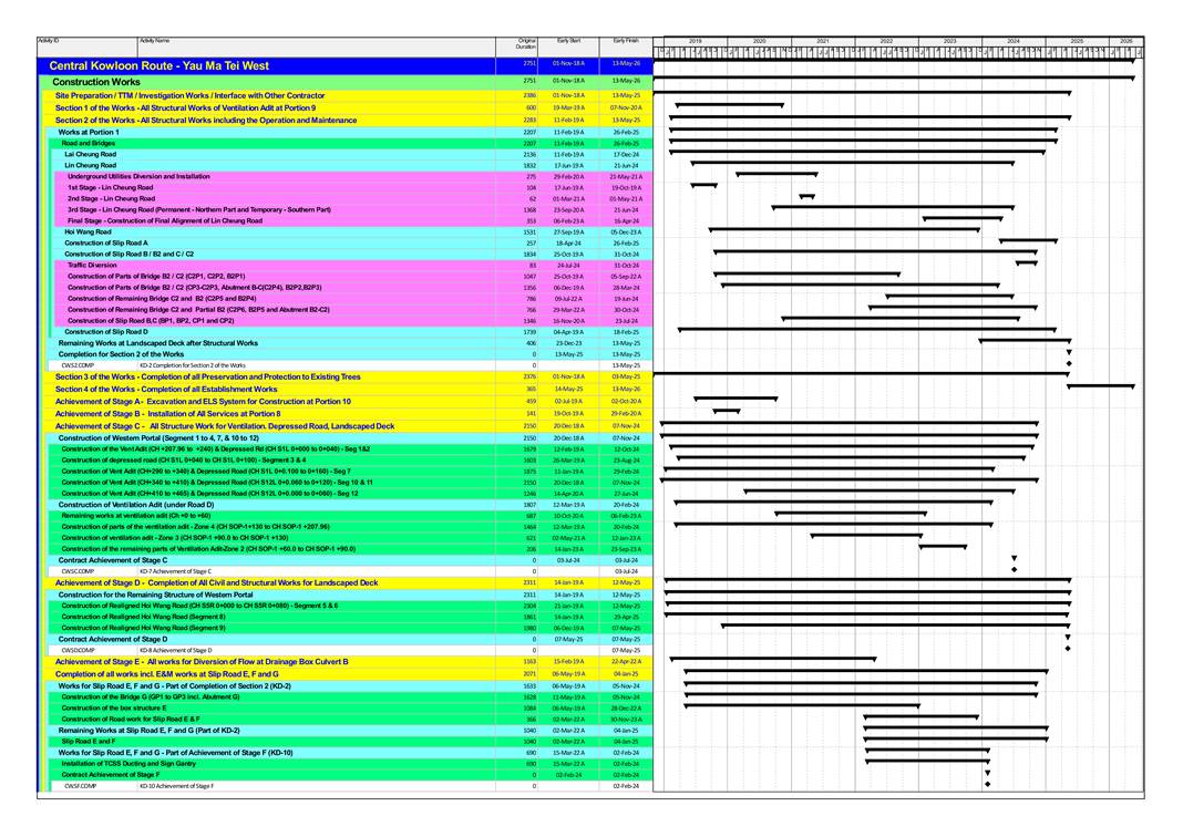 · Remaining Socket H-Pile at Segments 5, 8b and 9 (to complete) at Portion 1B and 1D · Noise Barrier S01 Bay 3 installation of Steel Structure, panel and Roadworks (along Lin Cheung Road) at Portion 1E · Noise Barrier C02 Panel and Road Works in progress at Portion 1E · Bridge Deck Construction at Bridge C2 (Deck 5) and Bridge B2 (Deck 4) in Portion 1B and 1G · Road D Structure I Construction at Portion 1E · Reinforced Concrete Works at Vent. Adit Ch 175~240 at Zone 4C and A1 in Portion 1E · Backfilling works at Abutment Wall along Slip Road E in Portion 1A and 1B · Slip Road E and F Construction in Portion 1A · Reinforced Concrete Works for Escape Route Staircase No. 1 to 2 in Portion 1F and 10 · Reinforced Concrete Works at Staircase North Side and continue Excavation and Lateral Support works and Excavation at South Side in Portion 1B · Upstand Wall and Column Construction at Segments 1 to 3 in Portion 1B and 1D · Landscaped Deck Construction at Segment 3 at segment 1B · Landscaped Deck Construction at Segment 4 (to start Roadworks) at segment 1B · Landscaped Deck Construction at Segment 10 (Roadworks) at segment 1F · Sump Pit construction at Segment 10 in Portion 1F · Late Cast at OHVA and Road Works at Segment 11 in Portion 1F · Landscaped Deck Construction at Segment 12a and to start Segment 12b in Portion 1F · Piling Works at Segment 5, 8 and 9 (West Side) in Portion 1D |
