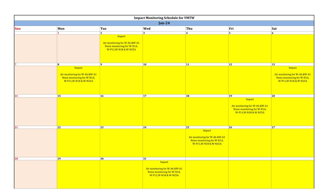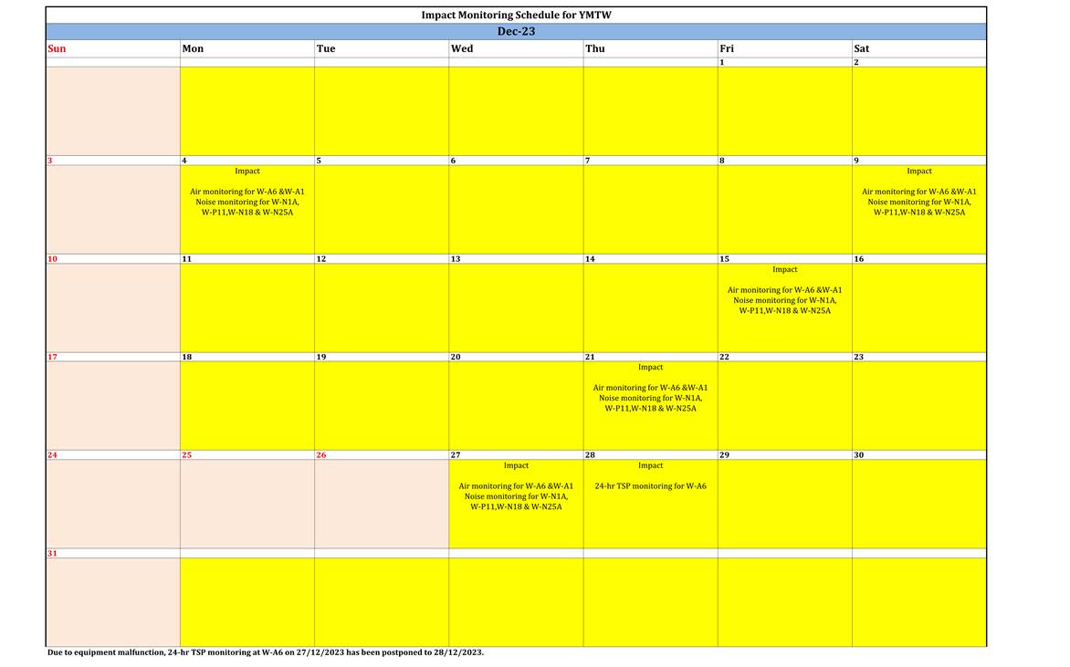 3. Environmental monitoring for the Project was performed in accordance with the EM&A Manual and the monitoring results were checked and reviewed. Joint weekly site inspections with the representative of ET, Engineer Representative and the Contractor for Contract No. HY/2019/13 were conducted on 5, 13, 19, 27 December 2023, whereas joint site inspection with the representative of IEC was conducted on 13 December 2023. The implementation of the environmental mitigation measures, Event and Action Plans and environmental complaint handling procedures were also checked.