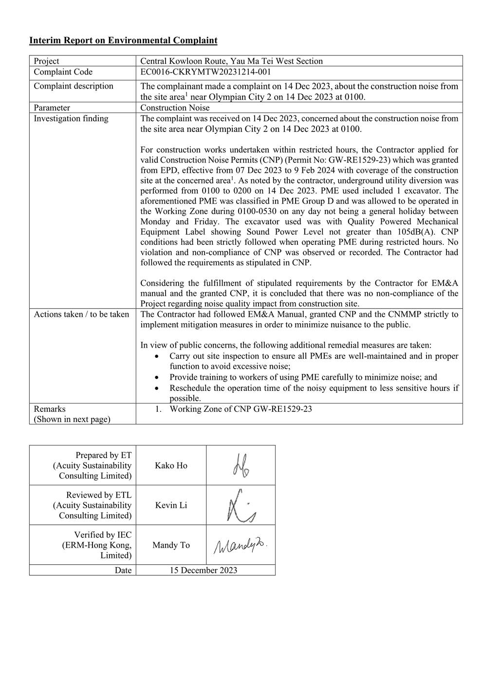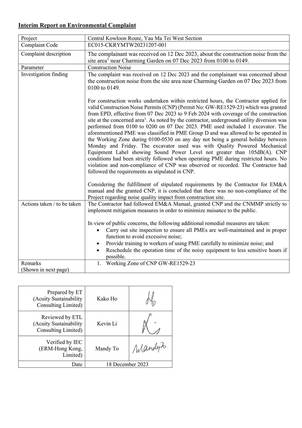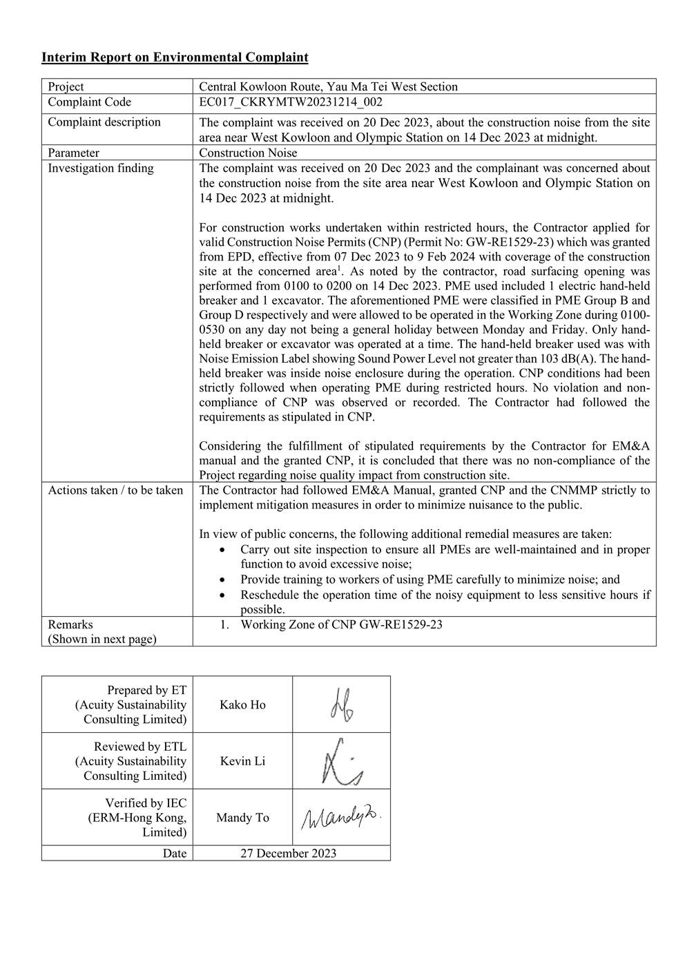A.8 Three environmental complaints were received in the reporting month. After investigation with Contractor, precautionary measures had been proposed to the Contractor by ET. The interim report for the complaint is shown in Appendix Q.
