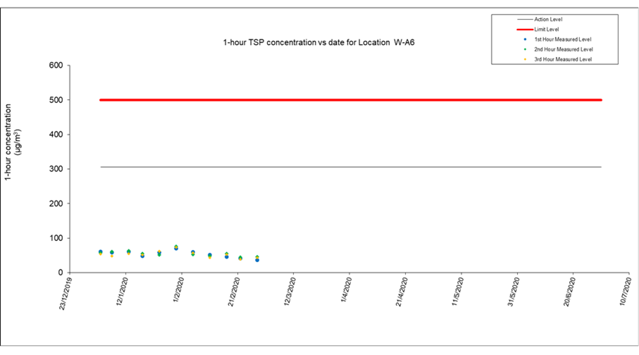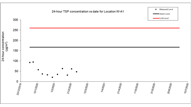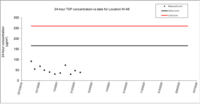 A.8 No exceedance of the Action and Limit Levels of 24-hour TSP and 1-hour TSP and construction noise monitoring were recorded during the reporting period.