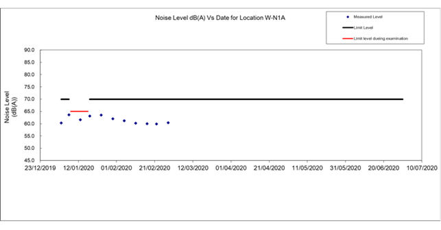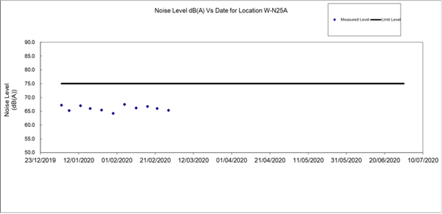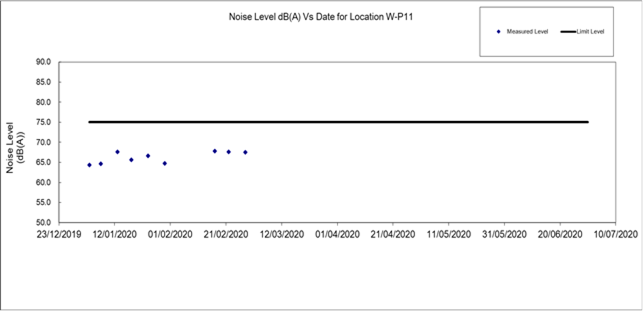 Remark: Noise monitoring station at the Coronation Tower 1 (W-P11) was temporarily suspended from 3 February 2020 to 16 February 2020 due to a case of novel coronavirus infection at the Coronation Block 2. Thus, there was no monitoring conducted at W-P11 on 5 and 11 February 2020.