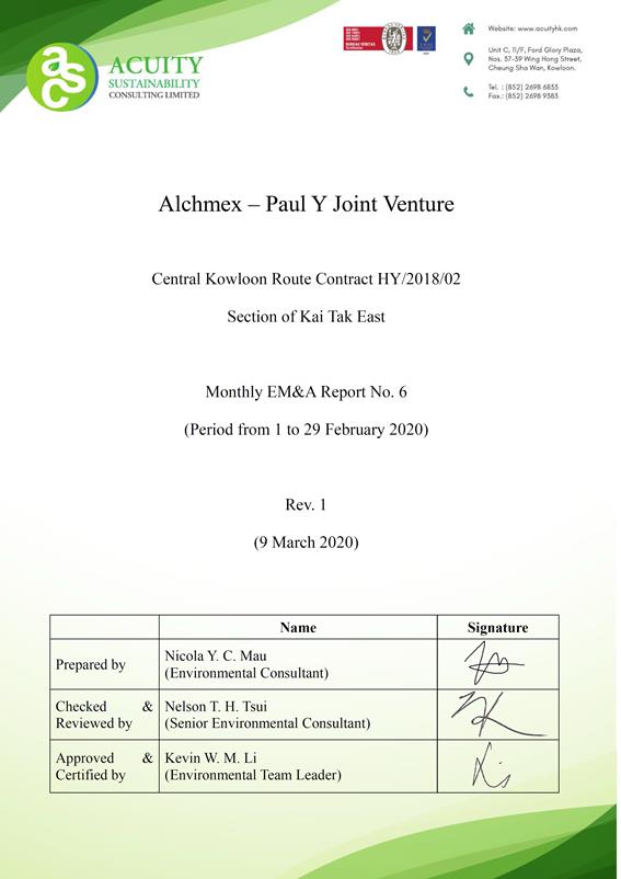 A.1 Alchmex – Paul Y Joint Venture (“Contractor”) commenced the construction works of Highway Department (HyD) Central Kowloon Route Contract No. HY/2018/02 – Section of Kai Tak East (“The Project”) on 9 September 2019. This is the 6th monthly Environmental Monitoring and Audit (EM&A) report presenting the EM&A works carried out during the period from 1 February 2020 to 29 February 2020.