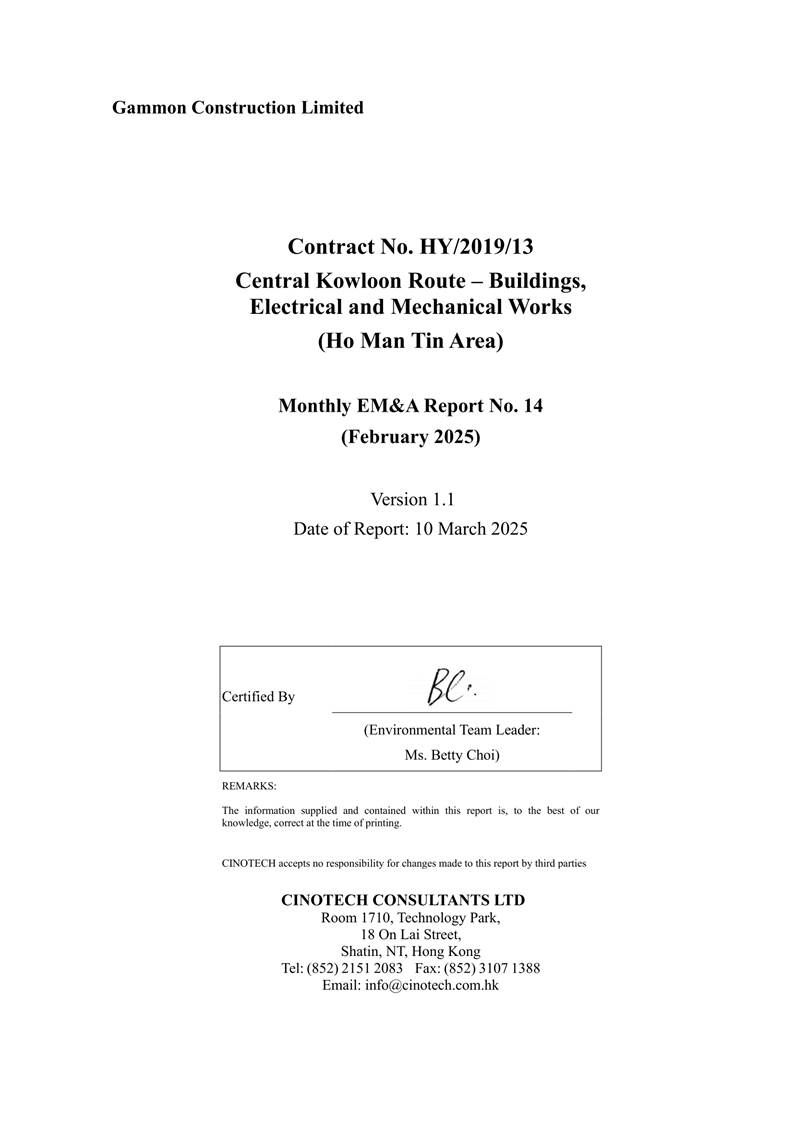 1. This is the 14th Monthly Environmental Monitoring and Audit (EM&A) Report prepared by the Environmental Team (ET), Cinotech Consultants Ltd., for Contract No. HY/2019/13 “Central Kowloon Route – Buildings, Electrical and Mechanical Works”. This report summarized the monitoring results and audit findings of the EM&A programme under the issued EP No. EP-457/2013/D, and in accordance with the EM&A programme in Central Tunnel (Ho Man Tin Area) during the reporting period from 1st February 2025 – 28th February 2025.