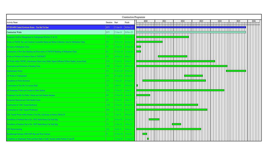 · Excavation from Ground Slab to Roof Slab at Zone E Access Shaft · Micro Pile Stitching (62 nos.) & Install Jack-up System at Yau Ma Tei Police Station(YMTPS) · Construct Super Structure from 1/F to 3/F at temporary Public Library cum Jade Hawker Bazaar Building (TPLCJHB) · Construct Super Structure from 4/F to R/F at TPLCJHB · Excavation from Roof Slab to Ceiling Slab at Zone A · Construction of Ceiling Slab at Zone A · Construction of Stage 1 D-wall panels at Zone B · Construction of Stage 1 D-wall panels at Zone C |
