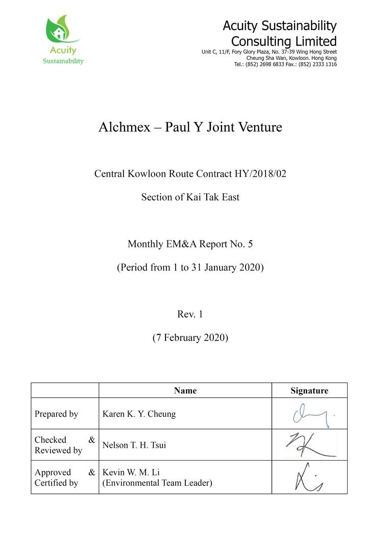 A.1 Alchmex – Paul Y Joint Venture (“Contractor”) commenced the construction works of Highway Department (HyD) Central Kowloon Route Contract No. HY/2018/02 – Section of Kai Tak East (“The Project”) on 9 September 2019. This is the 5th monthly Environmental Monitoring and Audit (EM&A) report presenting the EM&A works carried out during the period from 1 January 2020 to 31 January 2020.