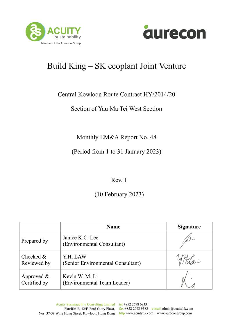 A.1 Build King – SK ecoplant Joint Venture (“Contractor”) commenced the construction works of Highway Department (HyD) Central Kowloon Route Contract No. HY/2014/20 – Section of Yau Ma Tei West (“The Project”) on 12 February 2019. This is the 48th monthly Environmental Monitoring and Audit (EM&A) report presenting the EM&A works carried out during the period from 1 January 2023 to 31 January 2023.