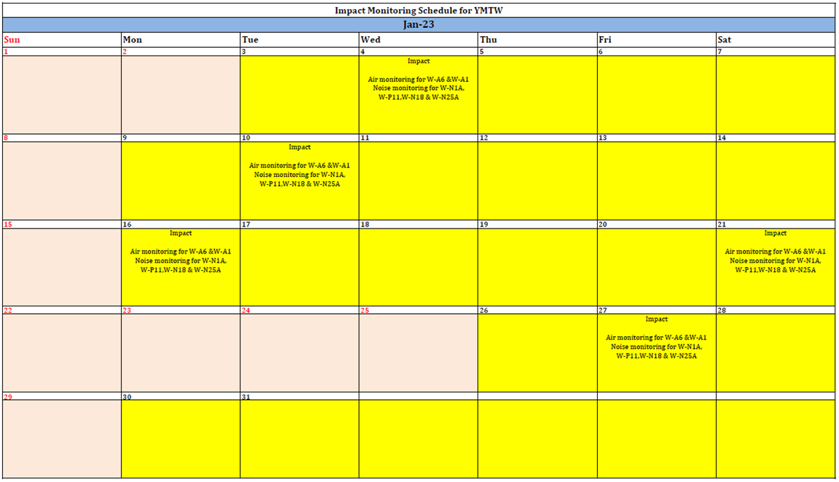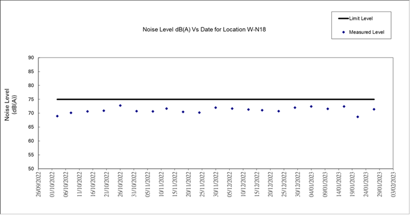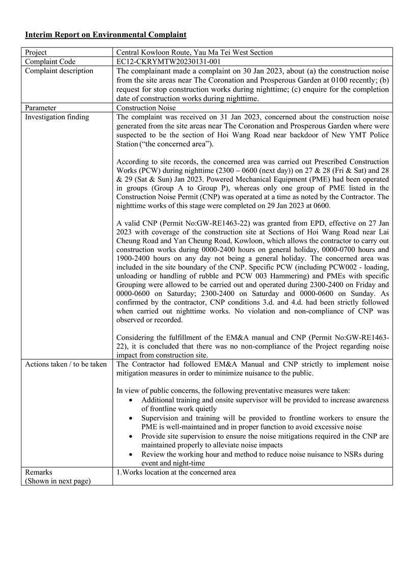 A.7 One Action Level of construction noise was triggered during the reporting period as documented complaint was received on 31 January 2023 related to construction noise from works areas at the section of Hoi Wang Road near backdoor of New Yau Ma Tei Police Station. No exceedance of Limit Level of construction noise was recorded in the reporting month. No exceedance of the Action and Limit Level of 24-hour TSP and 1-hour TSP was recorded in the reporting month.