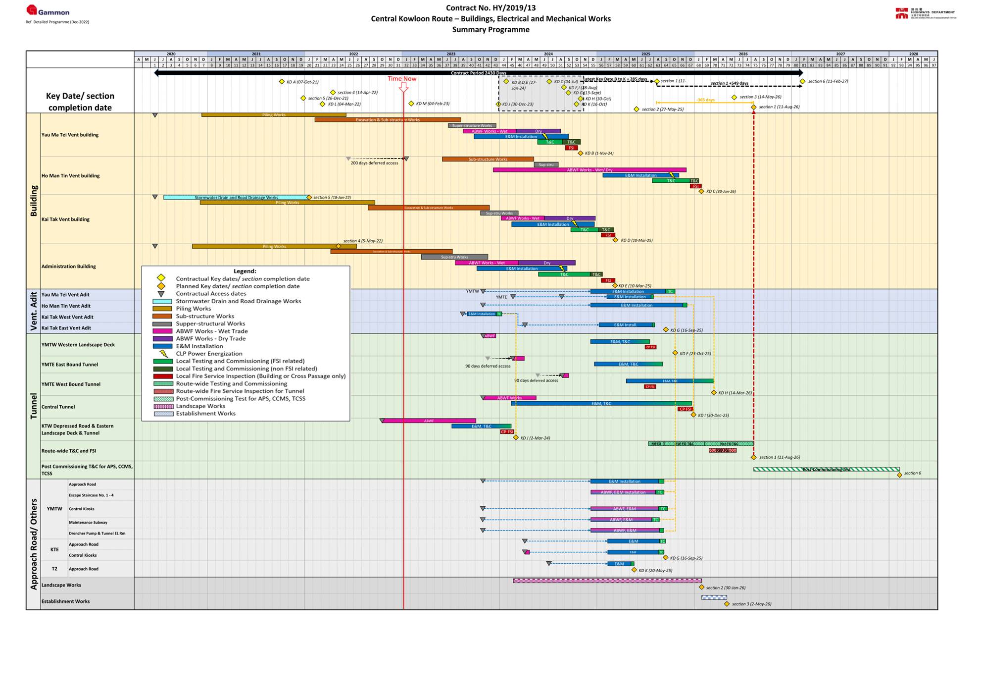 · Pre-drilling Works at Portion 1B and 1D · Socket H-Pile (Landscaped Deck and Bridges) at Portion 1B and 1D · Noise Barrier C02, C03 & S01 (along Lin Cheung Road) at Portion 1E · Bridge Deck Construction at Bridge C Deck 2 and Bridge B Deck 1 including portal installation in Portion 1E and 1B · 3rd Lin Cheung Road Traffic Diversion at Portion 1E · Abutment B-C construction at Portion 1B · Vent. Adit Ch 175~240 at Zone 4B, 4C and A1 in Portion 1E · Parapet Wall Construction at Bridge G in Portion 1B · Abutment Wall Construction at Slip Road E in Portion 1B · Excavation and Lateral Support Works and Excavation Works (Segment 4, 7, 10 to 12) for Vent. Adit and Depressed Road Construction including Escape Route Staircase No. 1 to 3 at Portion 1F and 10 · Vent Adit Ch 280~290 at Segment 4 in Portion 1D · Vent Adit Ch 300~360 at Segments 7 & 10 including Road Slab in Portion 1F · Vent Adit Ch 360~410 at Segment 11 including Road Slab in Portion 1F · Landscaped Construction at Segment 7 in Portion 1D · Pile Cap, Wall and Column Construction along Hoi Wang Road (Segments 5, 6, 7, 8 and 9) at Portion 1D · Landscaped Deck Construction at Segments 6 and 8a in Portion 1D · Hoi Wang Road Diversion Phase 2a at Portion 1D |