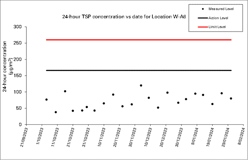 A.7 No exceedance of Action and Limit Level of construction noise, 24 hour TSP and 1 hour TSP was recorded in the reporting month.