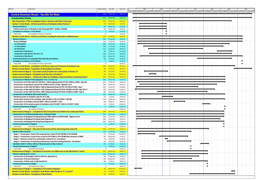 · Pre-drilling Works at Portion 1B, 1D, 1E and 1F · Tree Felling at Portion 1B and 1E · Socket H-pile at Portion 1B, 1D, 1E, 1F and 1G · Removal of existing Steel Bridge at Portion 1B, 1E and 1G · Excavation and Lateral Support (ELS) and Excavation for Vent Adit Construction Ch 0-60 at Portion 9 · Pipe Pile at D-wall and Vent Adit (Ch-250~280) at Portion 1D, 1F and 10 · Guide Wall and D-Wall breaking works at Portion 1F · Reinforced Concrete(RC) works for Vent Adit at Ch 0-60 (partial only) at Portion 9 · Jacking Pit Construction of Sewerage System at Portion 1B · Watermain Installation at new pipe sleeve (pipe jacking) at Portion 1B · Remaining Watermain Installation at Portion 1B and 1D · Pile Cap and Pier Construction at Bridge G including Abutment G at Portion 1B · Pipe Cap and Pier Construction at Bridge B2/C2 (C2P1, C2P2 an B2P1) at Portion 1E |