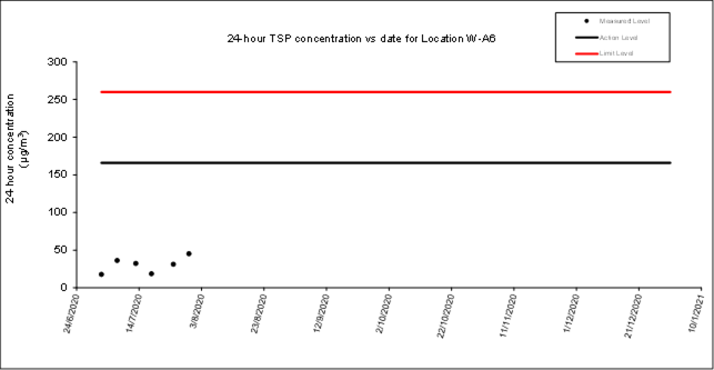 A.4 Due to the technical problem for HVS equipment on 24 July 2020 at Man Cheong Building (W-A6), 24-hour TSP dust monitoring was suspended. Equipment inspection was conducted and the problem was fixed on 25 July 2020. Supplementary 24-hour TSP dust monitoring was conducted on the same day.