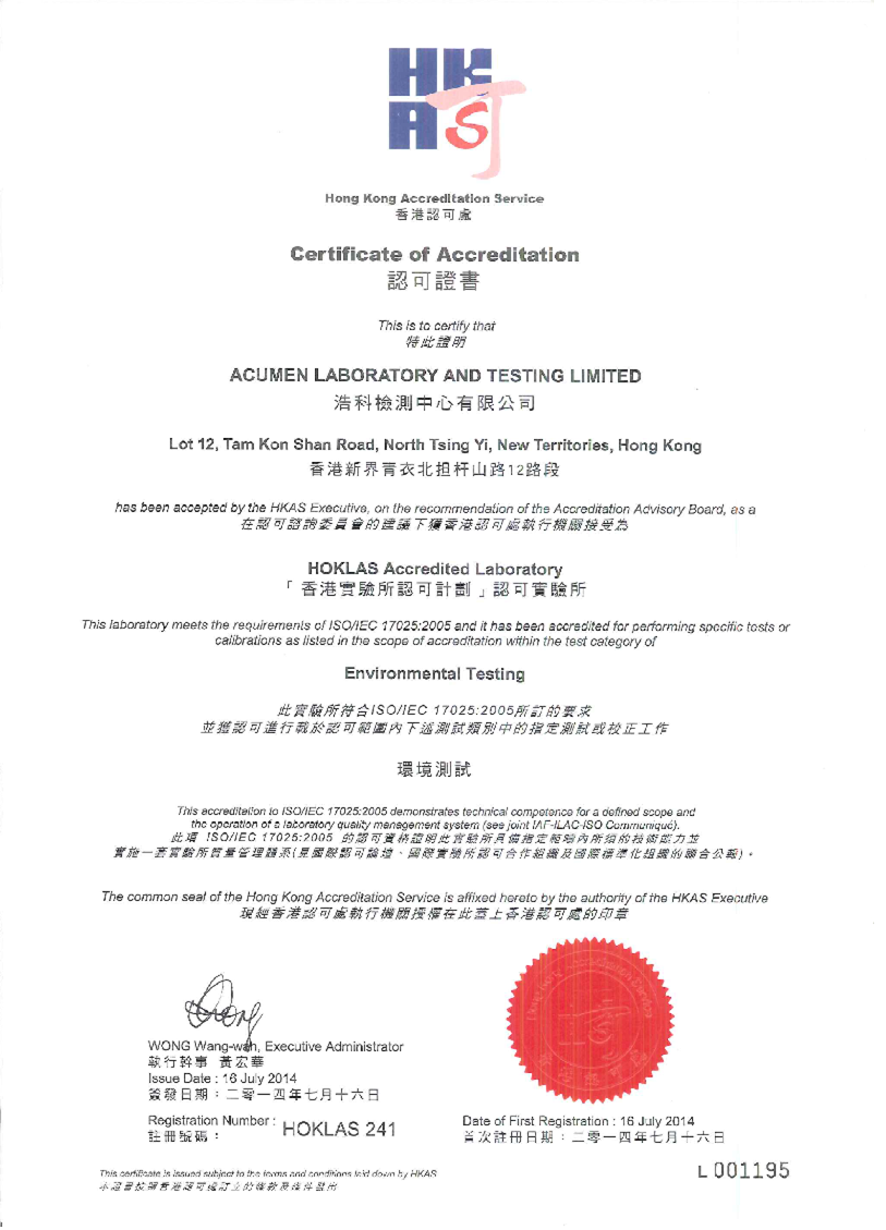 I. The Certification of Laboratory with HOKLAS Accredited Analytical Tests