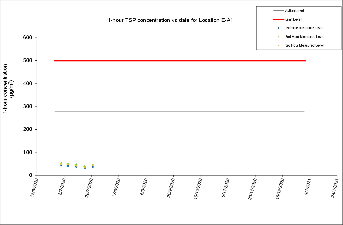 A.4 Due to the short-cirucited electricity supply for HVS equipment on 17 Jul 2020 at Hong Kong International Trade and Exhibition Centre (E-A1), 24-hour TSP dust monitoring was suspended. Immediate equipment inspection was performed and the problem was not fixed on 21 Jul 2020. A back-up HVS equipment was replaced on 22 Jul 2020 for the malfunctioned HVS equipment at E-A1. Supplementary 24-hour TSP dust monitoring was conducted on 22 Jul 2020.