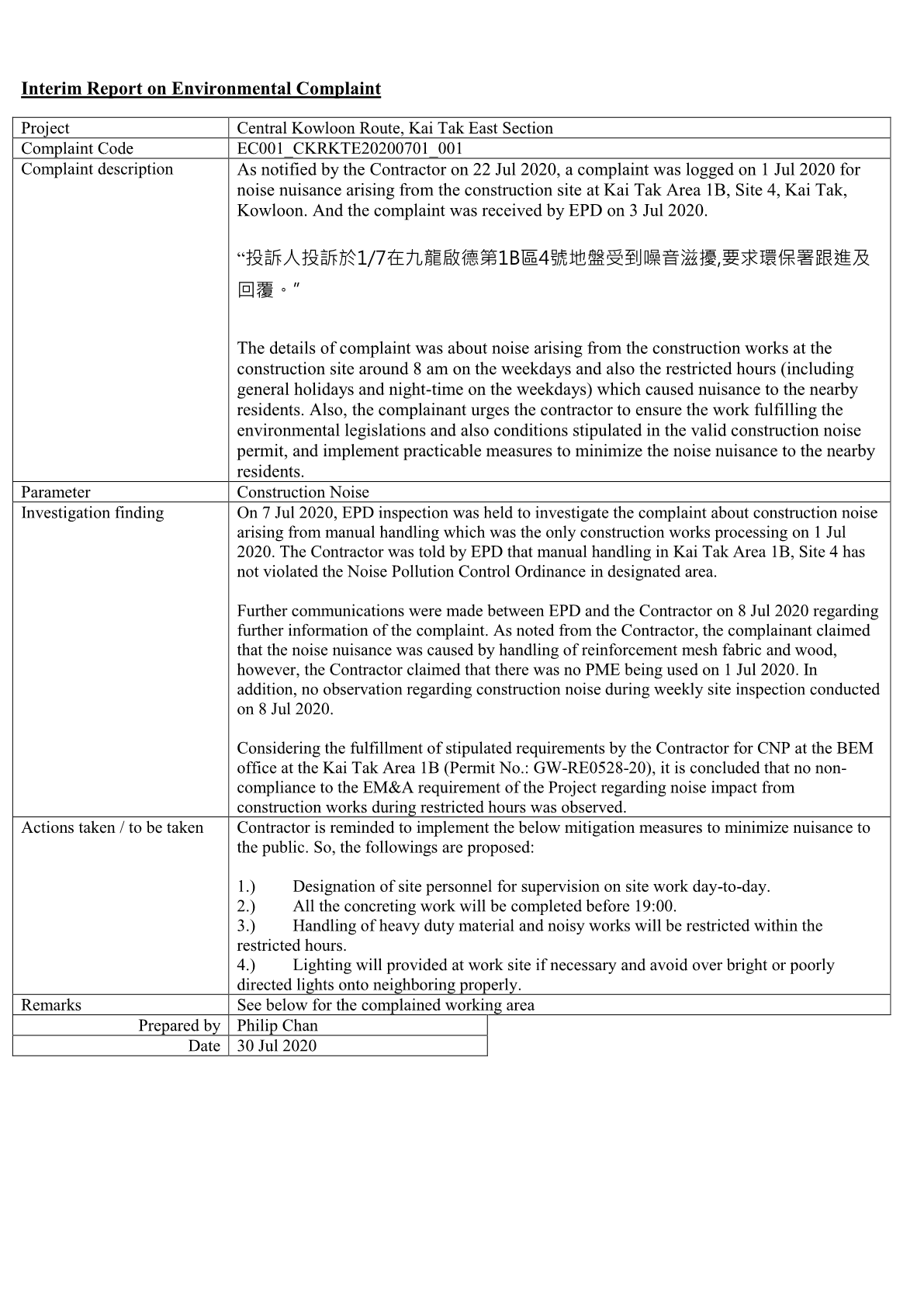 A.10 One noise-related complaint was received in the reporting month on 1 Jul 2020. After investigation by the senior environmental inspector from EPD and Contractor, precautionary measures have been proposed to the Contractor. The interim report for the complaint is shown in Appendix O.