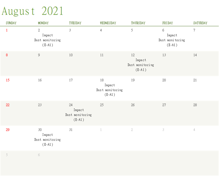 B.3 Site audits were carried out on a weekly basis to monitor and audit the timely implementation of air quality mitigation measures within the site boundaries of this Project. The summary of site audits are shown in Table 6.1 of this report.