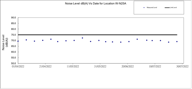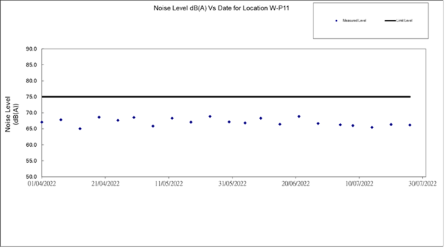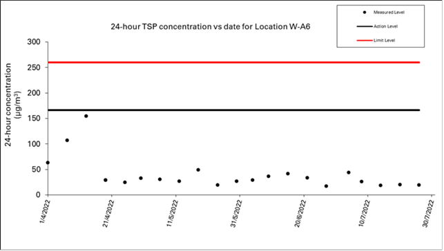 A.7 Two Action Levels of construction noise were triggered during the reporting period as documented complaints were received on 13 and 15 July 2022 related to construction noise from works areas at Portion 1D and 1F. No exceedance of the Limit Level of construction noise was recorded in the reporting month. No exceedance of the Action and Limit Levels of 24-hour TSP and 1-hour TSP was recorded during the reporting month.