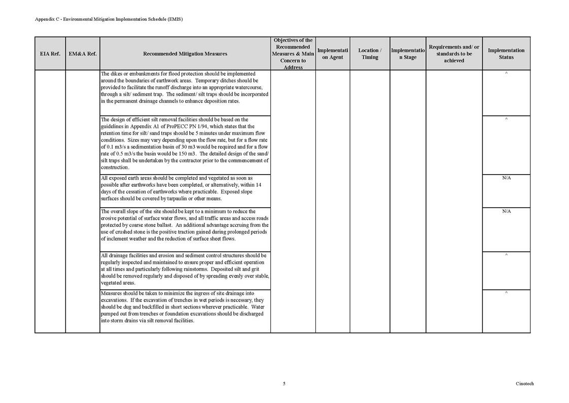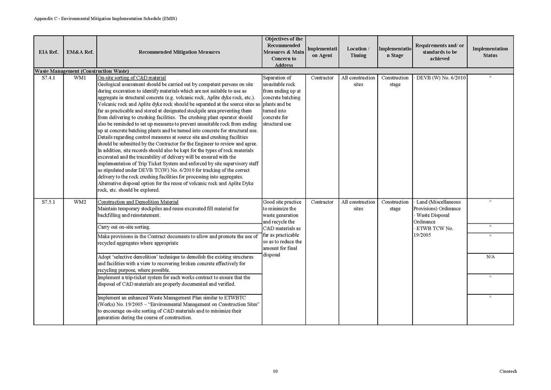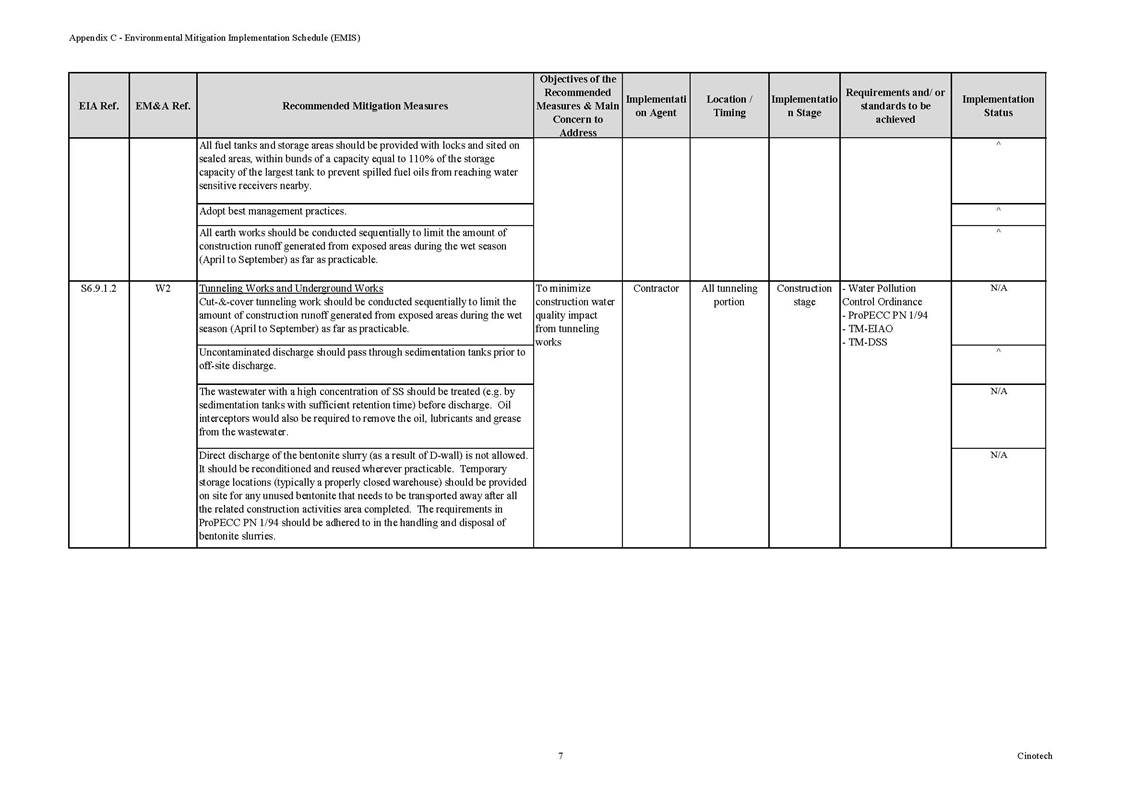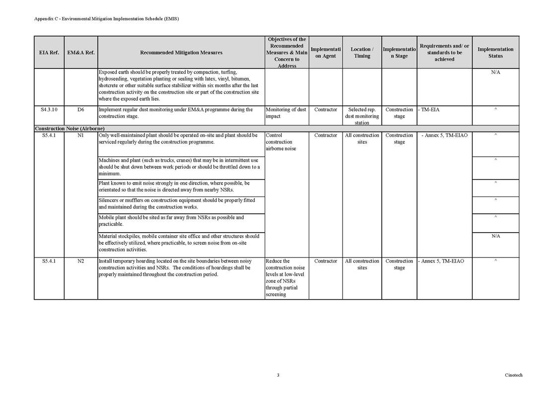 6.3 According to Environmental Permit, the approved EIA Report (Register No.: AEIAR-171/2013), and the EM&A Manual of the Project, the mitigation measures detailed in the documents are recommended to be implemented during the construction phase. An Environmental Mitigation Implementation Schedule (EMIS) is provided in Appendix C.